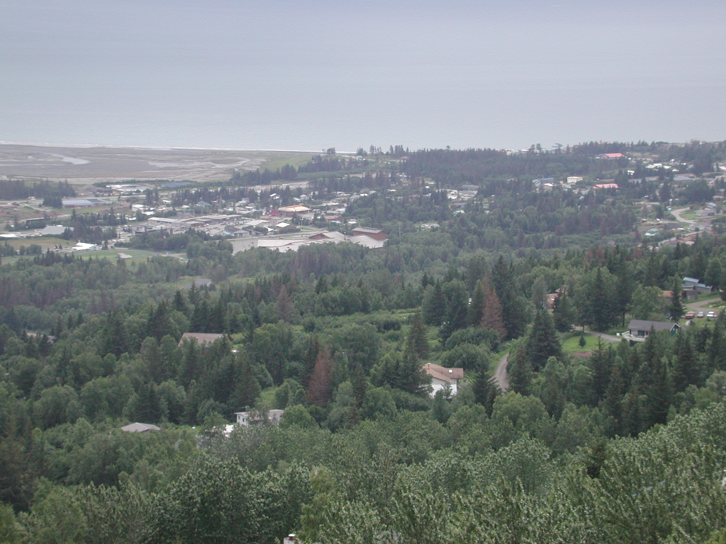 We slept in after being up early and going to bed late for several days. Since the sun was shining brightly which does not happen very often in July and August as it is the rainy season on the Kenai we decided to change our plans and go touring. We went to Soldotan and fueled up as it was good to see some reasonably priced diesel since it was quite a bit higher at Homer. We stopped at Joanna's Fabrics in Soldotna which had a llot of fabric and crafts at reasonable prices. We then headed for Kenai about 12 miles away and went north. We checked on the fishing spot on the Cook Inlet and found they had already sold their morning catch and would have more toward evening. They can fish from 7 am to 7 pm. on Monday and Thursdays only. They told us about a minature display of the oil platform and setup that is in the Kenai Airport so we will take a look at it tomorrow. We than went to Nikiski Beach road and seen the oil platforms out in Cook Inlet and the oil tankers. I tried the telephoto but it was still hazy toward the oil platforms and a long way out so really could not get any good shots. I am going to have to spend some time reading the Coolpix 990 Nikkon Manual. We then returned to Ikenai and seen the Russian Orthodox church and got a tour inside. We also called Mariah Tours in Seward from the visitors center and made reservations for Monday for a wildlife and glacier tour. We then to the bridge road and got on the westerly side of the Kenai River and the took Kalonoski Road which turns into Funny River Road right west of Soldotna which is the road we are camped on so that is much quicker and we will take it tomorrow when we go to the ham dinner at the airport in Kenai.and also look at the oil platform display. Kenai is a very busy airport as this is a popular tourist destination for fishing and also the major jumping off point for flying to the Aleutian Islands. When we got back to the trailer we started processing the Halibut. It sure was easy already being fileted. We just took the skin of and cut it up and put it in the quart canning jars. We finished 14 quarts and got the rest ready to be canned Friday. We just kept the jars in the refrigerator over night. We will end up with 16 quarts and one pint of Halibut and 1 quart of Orange Rock Bass and 18 pints of Razor Clams. We also have two big meals of frozen Halibut and one meal of fresh Halibut. I then took the radio equipment from the 5th and the laptop and took the 600 watt inverter out of the 5th since we never use it and headed out to find a place to make the schedule and try doing E-Mail from the F-350 for the first time. There are some many trailers and so much electronic noise it it tough to operate from the park here. I found a good site on a pull of on Funny River road that was up out of the valley and set up. I set the equipment on the passenger's side seat as well as the laptop. I had the inverter in case the laptop battery would need charging but it did not. I plugged the TNC into the accessory 12 VDC plug in the F-350 and hooked the 12 VDC cord(which I had prepared in advance for just such an occurance) from the radio to the battery bank cable that normally goes to the 5th. Since I did not have another 12 vdc connector to match this I lashed it together with a vise grips. I need to get the correct connect and that will work good except if it was pouring down rain. It would also work great for hooking up the equipment on a picnic table or in the screen porch we have so one could operate outside if it was hot but wanted to keep the bugs away. I need a second plug inside to hook to if it is raining hard. I made the 9 pm sked with AC0M and N0ABE and after that sent and got my E-mail. Signals were quite good so the 9 pm central and 6 pm Alaska time seems to be a good time. Once I got back to the trailer park I visited with Walt and Alice from Phoenix quite awhile and then we had chicken for supper. We were tired and went to bed about 10 pm. It is very, very light yet at 10 pm but it really don't bother us any sleeping.