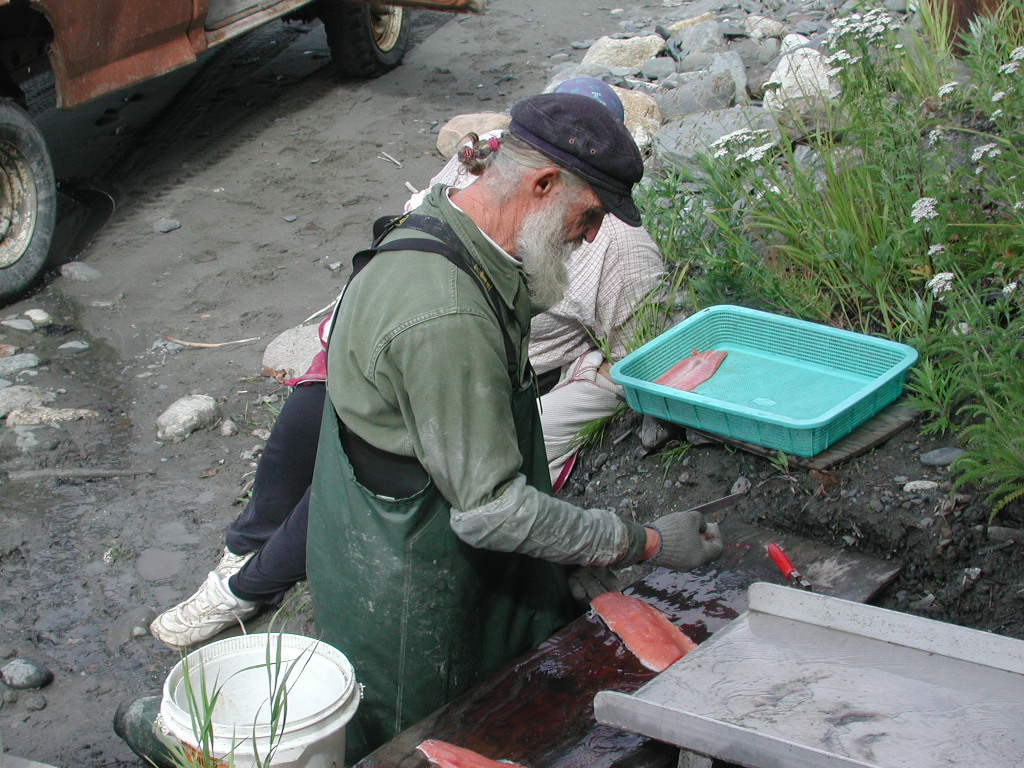 While we were getting clams the fellow with the boats came by and set a net and he thanked me for running the truck down for him and getting him out and he said he would give us a special deal on the fish when his two sons got back in. After we got back to the F-350 and got cleaned up as it was raining hard but fortunately we have good rain gear but we got some sand and mud on the rain gear so we cleaned that off and headed to where the fellow said we could get some fish. We seen him headed to a little coffee stand on the beach and he waved. We parked and pretty quick he came up to the pickup. Now you find out the benefits of being kind and talking to the locals. He visited with us about 20 minutes. He is a MD from California named Teddy and has a clinic but during the summer fishing season we comes up here and him and his boys do the commercial fishing. They have some long term plans of doing a resort on the cliff above clam gulch and having a tram running down to the beach. He told us how to clean the clams and about fishing and where to find some butter clams and we are going to get some smoked pink salmon from him tonight where he stays by a cannery. We then headed north and found the plant so we know where to find him tonight and then along Cook Inlet to Kenai and where the river runs into the ocean and again talked to a bunch of locals at a park over looking the mouth of the Kenai and seen a mob of people dip netting Reds. They had a QUAD stuck in the mud and the tide was coming in fast. I watch thru my glasses were they in a panic. They managed to get another QUAD down there and get a rope on it and tow it out. The water was pretty high on it. One of the locals told us a place to go on the beach on Monday and you can watch them put in nets and buy fish also. I think we pretty well have that figured out after talking to Teddy the MD but it was nice. He told us about the sonar station where they count the salmon going upstrat and control the netting, etc. We then went north of Kenai and see the oil platforms, refinery, fertilizer plant and tankers they apparently drill from. It was rainy so if we get a sunny day we may go back. Tonight we are canning salmon, cleaning salmon and getting the clams ready to clean and probably get more clams tomorrow. I managed to fix Mikes busted handle on his clam gun. Quite a feat when you have to rely on what you have along pretty much. I did buy a wood dowl at Fred Meyers and we also bought 12 more quarts to can. I don't know what we are going to do if we get some big Halibuts. We had our first salmon tonight cooking up some tid bits. WOW! It is fantastic. They say Reds are the best and I believe them.